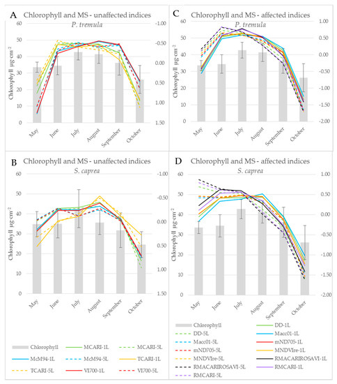 Chlorophyll a + b content of P. tremula (A,C) and S. caprea (B,D) during the season (bars; left axis) and a seasonal course of selected chlorophyll indices (lines; right axis) after z-score standardization. Left graphs (A,B) present indices unaffected by the measurement setup. Right graphs (C,D) present indices affected by the measurement setup. Graphs show absolute values after z-score standardization of indices computed from contact probe reflectance of a single leaf (1L-full lines) and a leaf stack (5L-dashed lines).