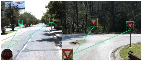 The detection must be done at the furthest possible distance, so that the driver has enough time to react and to stop in time. Examples of typical testing scenarios for the proposed approach are presented in Figure 1, which shows a distant stop sign and a yield (give way) sign.