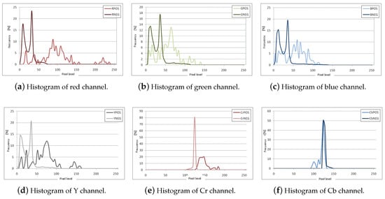 Under adequate illumination conditions, such as daylight or artificial lighting, the color of traffic signs is a feature that can be used to generate ROIs. Comparing the histograms of traffic signs in four color spaces, RGB, HSV, YCbCr and ErEgEb (the normalized RGB space) [,], it possible to observe in Figure 2 that some of the color spaces provide better discrimination capability between traffic signs and the image backgrounds. In Figure 2, the histograms labeled RPOS correspond to histograms of the stop sign, while the curves labeled RNEG correspond to the histograms of backgrounds or scenes that do not contain traffic signs.