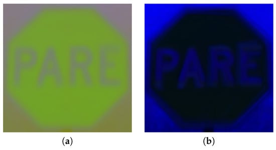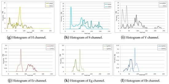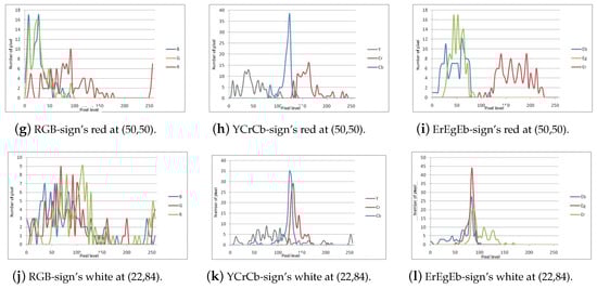The color space that shows the smaller overlap between the histograms of positives (signs) and negatives (non-sign) is the ErEgEb space, where in particular the channel shows a clear separation between the two classes. The channel histograms have a small intersection, but likewise it serves to discard a significant portion of negatives. Finally, the does not provide considerable information, but will be considered a part of the classification strategy, see Figure 2j–l. A similar analysis was conducted for the yield sign and the results allow to conclude that the ErEgEb space, and in particular and channels provide a better discrimination capability.