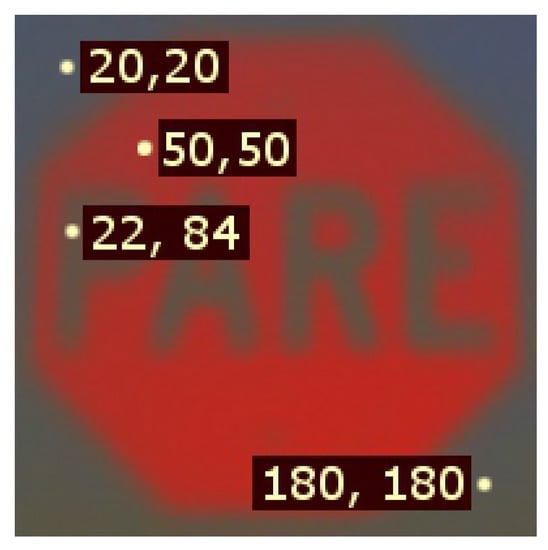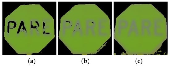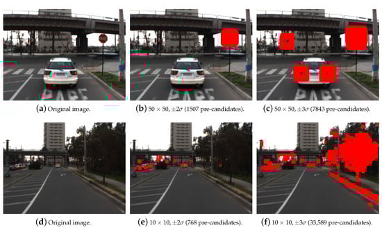 where is the value of channel c at the pixel location p within the traffic sign of the i-th reference image (positive), , is the number of positive images, is the number of pixels within the reference traffic sign area, is the mean value of channel c for the i-th image, is mean value of channel c across the ensemble of images, and is the variance of the mean values , . The value is set to minimize false positives and false negatives that will be passed to the recognition stage. A practical value that ensures the lowest amount of false positives while preventing misdetections was found to be . It is to be noted that using the so-called summed integral area tables or integral images [,] is possible to reduce the computation time of the average values on sliding blocks. Two examples showing the generation of preliminary candidates for ROIs using windows sizes of and pixels are shown in Figure 3 for values of .