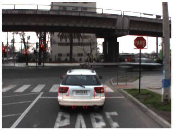 Traffic sign detection using visible-spectrum cameras may take different approaches. Some works implement feature classifiers. This means that a sliding-window method is used to compute features on different overlapping regions, which are then fed to the previously trained classifier [,]. The drawback of this strategy is that many positions and scales have to be tested using classifiers that may need computationally demanding training phases. More recent methods formulate a two-stage strategy, in which candidate or proposal regions are computed first by some “class-agnostic” segmentation process, i.e., extracting groups of pixels that share some characteristic without necessarily identifying whether they truly belong to the same class of object. In a second stage, some classification or decision process is used to complete the detection deciding whether some classes of objects sought are present or not. The methods proposed in [,,,,,,,,] can be found among recent approaches for traffic sign detection employing regional proposal strategies together with classifiers. The most recent approaches to segmentation and classification employed in traffic sign detection are discussed next.