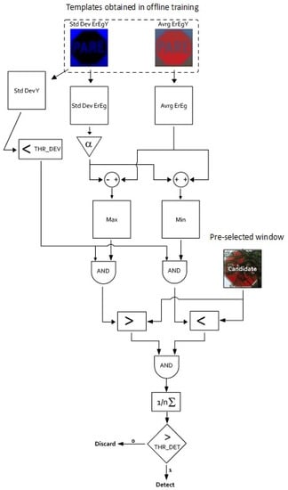 The second stage of the proposed traffic sign detection approach is responsible for solving the identification of ROIs as traffic signs of a given type. To this end, a set of images is employed to create two statistical models, one with the mean intensity and the other with its standard deviation for each pixel belonging to the traffic sign. Testing on a sliding block for the percentage of pixels that fall within the expected intensity range for a given location provides a discriminator to detect traffic signs from background and non-traffic sign objects. A flow diagram of the proposed method is shown in Figure 5. The corresponding pseudocode of the algorithm is presented in Algorithm 1. The most effective recognition of traffic signs is achieved applying the algorithm to the Er and Eb channels of the ErEgEb color space. Only two channels conveying the chromaticity information are sufficient because the magnitude normalization satisfies , making the third channel dependent on the other two (). The probabilistic model that defines the discrimination thresholds is discussed next.