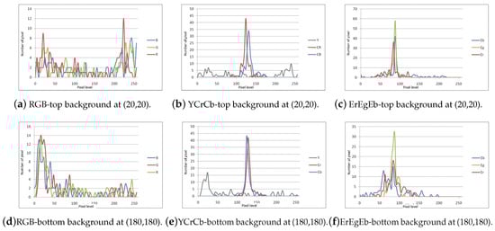 To this end, Figure 7 presents the representative points to the comparison of histograms of the pixels corresponding to the background and to the object of interest presented in Figure 8 reveals that the luminance channel Y spreads over the entire range of possible values for background objects. Hence, the standard deviation of the luminance channel is a good indicator to determine whether the pixel is part of the object of interest or part of the background. Figure 9 shows the mean and standard deviation for the luminance channel Y. It is clear that the template built using the variance provides higher contrast between background and foreground than using the mean value of the luminance to create a mask for discarding background regions.