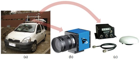 Experimental platform, vehicle (a); camera (b); and GPS (c).