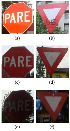Typical traffic signs of road intersections and roundabouts in Chile: stop and yield signs; under different lighting conditions (sunny (a,b), normal (c,d) and dark (e,f)) and observer positions.