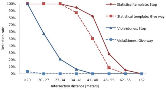 Comparison of detection rates versus distance between the Viola–Jones method and the statistical templates method for the stop and yield signs.
