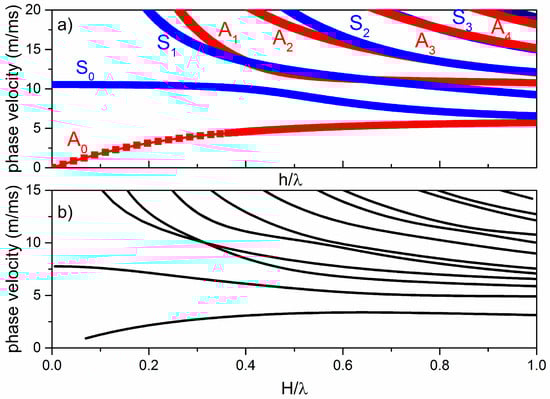 Lamb modes velocity dispersion curves are strongly dependent upon the material type, its crystallographic orientation, the wave propagation direction, and the plate composition (single or multilayered plates). As an example of wave propagation in homogeneous isotropic plates, Figure 1a shows the phase velocity dispersion curves of the fundamental and higher order Lamb modes propagating along the isotropic homogeneous a-SiC plate with a thickness of h = 5 µm in contact with air.