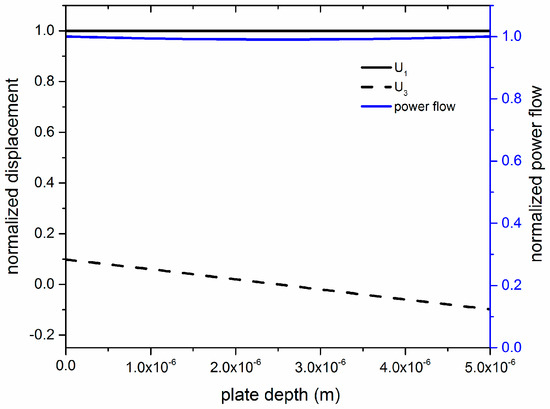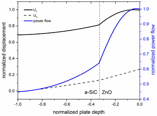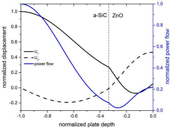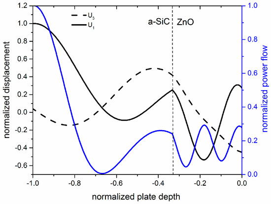 The U1, U3 and power flow depth profile for an a-SiC plate with a thickness of 5 µm (haSiC/λ = 0.1, λ = 50 µm).