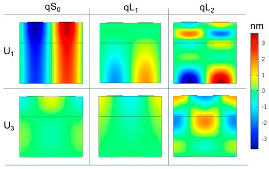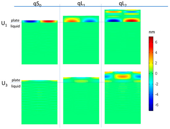 The displacement components U1 and U3 of the three modes propagating along the a-SiC/ZnO plate that makes contact with the liquid. The a-Sic and ZnO layers have a thickness equal to 5 and 2.5 μm; the plate width is equal to one λ; the H/λ = 0.15, 0.45, and 0.85, for qS0, qL1, and qL2, respectively.