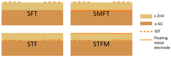 Lamb mode devices based on piezoelectric layers use input and output interdigital transducers (IDTs) to launch and receive the acoustic waves. In the a-SiC/ZnO composite plate, four piezoelectric coupling configurations can be obtained by placing the IDTs at the a-SiC/ZnO interface (STF) or at the ZnO-free film surface (SFT), further including a floating electrode opposite the IDTs (STFM and SMFT). The four configurations are depicted in Figure 9.