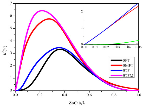 The K2 vs. the ZnO thickness-to-wavelength ratio for the four coupling configurations. The a-SiC normalized thickness is fixed at h/λ = 0.1.