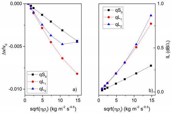 When a liquid contacts the acoustic waveguide, the in-plane particle displacement component of the acoustic mode couples to a very thin viscous boundary layer of thickness , where η and are the liquid viscosity and mass density. The viscous liquid was supposed to be a mixture of water and glycerol; the fraction of glycerol by volume ranged from 0 (only water) to 0.6, and the ranged from 0.95 to about 15 kg·m−2·s−0.5 [21]. The effects of both the viscosity η and the mass density of the water/glycerol mixture on the wave velocity and IL was analyzed numerically. The real and imaginary parts of the phase velocity (vi and vr) of the three modes were calculated for different concentrations of the water/glycerol mixtures. The relative changes of the phase velocity Δv/v0 and the IL as a function of are shown in Figure 11a,b. It was assumed that the examined glycerol-water mixture was in contact with the a-SiC surface of the composite plate.