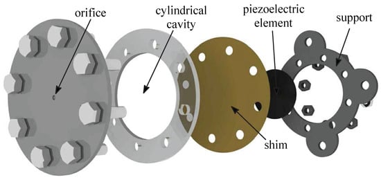 As depicted in Figure 1, a SJ is an electromechanical device consisting of a relatively small cavity, which is sealed from one side by an elastic vibrating diaphragm, and from the other one it is linked to the external environment through a slot or an orifice. This paper will refer to nominally axisymmetric devices only, with round orifice. An exploded view of a typical actuator is reported in Figure 2; the assembly has been designed to fully exploit modularity, allowing independent variations of diameter and height of both the cavity and the orifice. The oscillation of the diaphragm (wall), which is generally constituted by a thin metallic shim on which a piezo-ceramic element is glued, produces periodic cavity volume changes, with corresponding pressure variations, that cause subsequent alternation of ejection and suction phases of fluid across the orifice. During the expulsion phase a vortex ring forms near the orifice exit which, under favorable operating conditions, convects downstream by its self-induced velocity towards the far field. A few cycles are required for the formation of a train of vortex rings that interact with each other and break up due to the viscous dissipation, eventually “synthesizing” a turbulent jet always directed downstream. In more detail, during the suction phase, a stagnation point is formed, located about one orifice diameter away from the orifice itself. This point which separates the near field region, where the flow is directed towards the cavity, from the far field where the jet is established. A major characteristic of this jet is that the average mass flow rate during an operation cycle is null, whilst a non-zero average momentum rate is produced. Furthermore, its generation does not require any continuous fluid supply, because it is synthesized directly from the surrounding fluid, see, e.g., Smith and Glezer [15] and Cater and Soria [16].