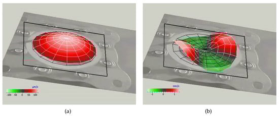 where is the frequency of the principal vibration mode of a rigidly clamped disk, assumed equal to the first fundamental mode of the shim only (Rathnasingham and Breuer [34] and Kinsler et al. [35]), that is the structural element actually clamped, while is the diaphragm mass including both shim and piezo-ceramic disk. Higher modes also can be excited at relatively high frequencies, as depicted in Figure 3, where the diaphragm deflection detected by a Polytec laser scanning vibrometer PSV400-H4 is reported for operation frequencies f of 1555 Hz and 5370 Hz, respectively, and very low voltage, V. The device has an aluminum shim with a diameter of 42 mm, while the chamber is 3 mm in height. Note that the presence of higher-order structural modes is not desirable because the distorted shim shape vibrating at natural frequencies higher than its fundamental one produces little net displacement of the surrounding air.