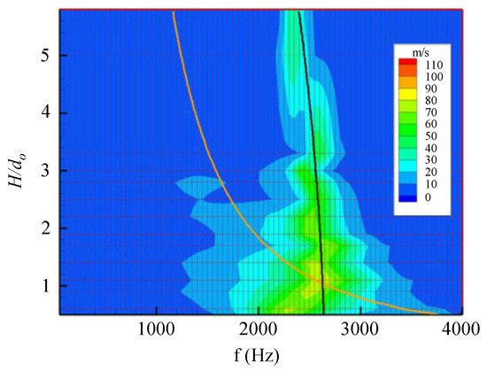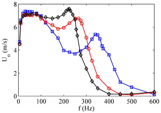 Gomes et al. [37] carried out an extensive experimental investigation about the influence of the orifice nominal depth . They preliminarily claimed that there are two effects acting on the flow traveling through the orifice which are of importance to understand how the velocity behaves with increasing the orifice length: firstly, the shorter the extension of the orifice, the bigger the effect of vena contracta on the volume flow rate will be. Secondly, the boundary layer displacement thickness grows with length, due to the action of shear of the slow fluid near the wall on the faster flow in the core. This tends to slow down the core flow and hence to reduce the peak velocity. Therefore, there must be a compromise between these two phenomena such that an optimum can be reached. Gomes et al. [37] argued that the optimal length of the orifice would be the summation of the length required to achieve a flow marginally attached to exit edges of the orifice, so as to minimize the vena contracta effect (i.e., ), plus the minimum length required for the flow to reattach after the bubble separation due to the vena contracta (about half exit diameter), resulting in a total orifice depth of around . The major findings of their experimental measurements are summarized as follows: the actuator peak velocity reduces with increasing the orifice depth; the unsteadiness of magnitude and position of the diaphragm resonance peak gradually reduces with increasing the orifice depth. The entire decoupling of cavity resonance from diaphragm resonance is gradually offset to lower frequencies with increasing . This effect supports the theoretical prediction of the inverse square proportionality between the Helmholtz frequency value and the orifice depth.