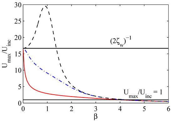 Amplification factor of jet peak velocity for decoupled oscillators () and , Equation (29). Continuous red line is for , dotted-dashed blue line for , dashed black line for .