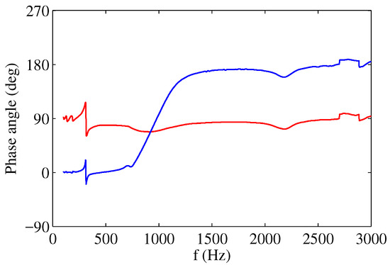 Computed phase angles for case 1 device of Gallas et al. [23]. Blue line refers to jet velocity—diaphragm velocity responses; red line to jet velocity - cavity pressure responses. Reprinted with permission from [31].