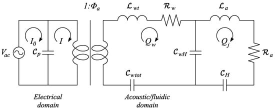 In case the SJ is realized with an electromechanical element, such as a piezoelectric thin disk, the equivalent electric circuit is depicted in Figure 8, which corresponds strictly to the mechanical system of Figure 5, where the transduction from the electrical to the acoustic/fluidic domain is represented through an ideal transformer, having the transformation ratio equal to the electroacoustic transduction coefficient, . Within the framework of the mass-inductance analogy, the inductances and correspond to the diaphragm and orifice air masses, respectively, the capacitances , , and correspond to the blocked electrical capacitance of the piezoelectric diaphragm (for more details see Prasad et al. [22]), the total diaphragm stiffness (including both parallel structural and acoustic stiffnesses, and , respectively), the coupling stiffness and the Helmholtz stiffness, respectively, and the resistances and correspond to the structural and fluidic damping factors, respectively.