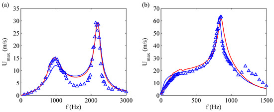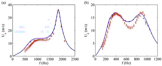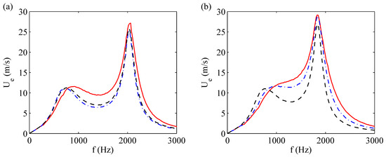 Frequency response of saddle point flow velocity for (a) the aluminum actuator and (b) the brass actuator at different equivalent length; red solid line refers to , blue dashed line to and black dotted line to .