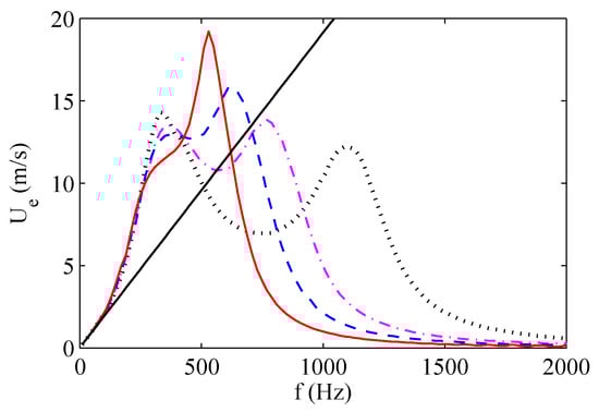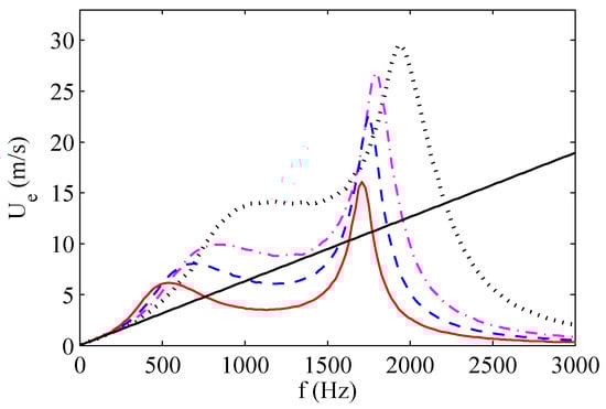 The resulting algebraic, non-linear system can be implicitly solved to give the amplification factor of the maximum jet velocity with respect to the incompressible velocity, . Upon back-substitution of the undamped (coupled) resonance frequencies , Equation (15), one obtains