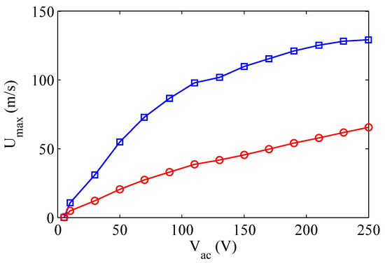 where the average linear displacement is expressed as the cavity volume variation divided by the wall area, and represents the applied voltage. It is important to note that, despite what is shown by Equation (4), the dependence of the dynamic deflection of the piezo-element on the driving voltage is not linear, but the slope of the curve deflection-voltage decreases with increasing voltage, and it is a function of the operating frequency, as investigated by Krishnan and Mohseni [36]. This behavior of the piezo-materials influences the performances of the actuators, as will be shown in Section 4.2. The effective acoustic piezoelectric coefficient is defined as the ratio of the volume variation to the applied voltage, when the driving differential pressure across the piezo-element is null, Prasad [22],