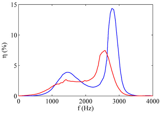 Efficiencies of brass actuator at modified resonance structural frequency. = 0.06. Reprinted with permission from [39].