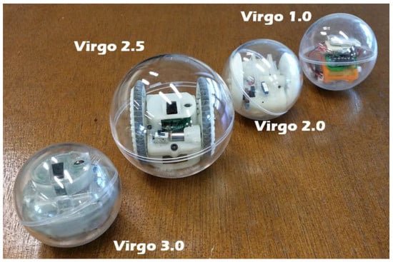 Over the past decades, autonomous mobile robots [1,2,3,4] have received significant attention in the robotics community and challenges related to their navigation [5,6,7] have motivated countless studies. Nonholonomic robots [8,9], being one of the vastly developed categories, have wide applications in surveillance and transportation. Various locomotion mechanisms [10,11,12,13] have been employed depending on the application environment. Spherical robots, due to their natural geometry and efficient locomotion technique, have remained a promising research area. As a closed system, all the functional components are sealed inside the shell and protected from potential external hazards or interference, which makes spherical robots especially suitable for reconnaissance, rescue missions and even underwater operations [14,15,16]. VIRGO [17,18] is a novel miniature spherical robot developed in Singapore University of Technology and Design (SUTD) with unique surveillance capabilities and high battery endurance. The drivetrain consists of a differential drive cart unit and operates with a mechanism similar to that of a hypocyclic geartrain. This driving mechanism has been chosen due to its simplicity and potential to miniaturize. Consistent efforts have been made to improve its dynamic performance while shrinking the overall size. Currently it is capable of achieving a 3 Wh/113.1 cm3 energy density and 200 mW operational power draw. The radius of the latest version is 3 cm, as shown in Figure 1.