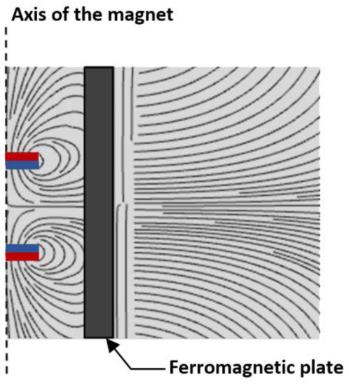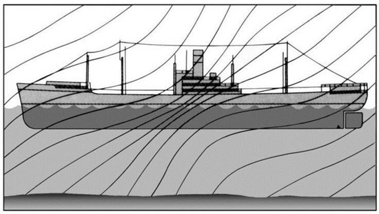 Existing researches have frequently exploited the Earth’s magnetic field to detect the magnetic anomalies [31,32,33]. Modelling the Earth as a giant dipole magnet, the Earth’s magnetic field on the ground can be approximated to be uniform and parallel to the ground. This field requires no external source and distorts wherever a ferromagnetic object is presented. Figure 2 [34] shows the distortion of Earth’s magnetic field in the vicinity of a steel vessel and the line density represents the magnetic field strength.