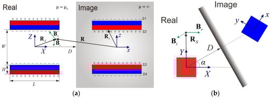 where T represents the transformation matrix from the image coordinate system x-y-z to the real coordinate system X-Y-Z; S1, S2, S3 and S4 refers to the surface of magnetic poles; represents the image charge, which is a constant value when assuming the magnetization of the magnet is constant; R − Ri represents the vector from the location of the image charges to the location of calculated magnetic field in the x-y-z coordinate system.