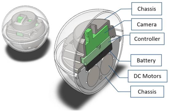 To adapt the magnetic proximity sensor to the spherical robot, the configuration of VIRGO is examined first. As shown in Figure 5, all the functional components including the camera, controller, battery and the DC motors are fitted inside a chassis that located at the central area inside the sphere. Two wheels are installed at the bottom of the chassis and transfer the motion to the shell.