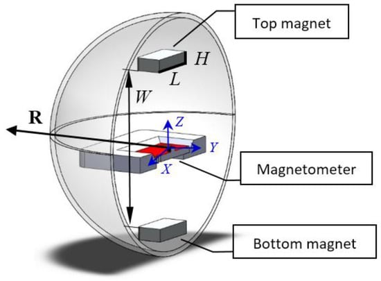 where R and Ri represent the location of the sensor and image charges in the image coordinate system; S1, S2, S3 and S4 refer to the pole areas of the image magnets. By observing the equation, it is apparent that the magnitude decreases as the distance to the obstacle increases. Equation (3) cannot be used to accurately estimate the actual magnitude of distortion field in real life due to the infinite assumptions on the magnetic permeability of the obstacle and the obstacle height. With finite objects of finite magnetic permeability, the distortion of the magnetic field is expected to happen on a smaller scale and within a smaller area. However, both the size and geometric configurations of the magnets are considered in the model and their effects on the sensing performance can be reasonably studied.