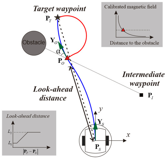 Illustration of the pure-pursuit method and obstacle avoidance behavior integration.