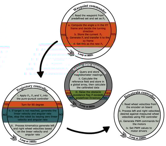 Once a decision of obstacle being detected has been made, the control unit will trigger an interruptive protocol, which includes stopping the motor, turning on the spot and going to the intermediate waypoint. After that, the previous waypoint will be retrieved and the trajectory is recalculated from the current location. If the robot speed is beyond the stability threshold, which means an abrupt stop will cause the robot to tumble, the robot will slow down first and then stop entirely. This choice will be made by the control unit depending on the preset stability threshold and the robot proceeding speed when detecting the obstacle. As illustrated in Figure 8, the detailed algorithm includes four interactive threads: sensor data acquisition, waypoint commander, trajectory controller, and drivetrain controller. The sensor data acquisition thread processes the measurements and decides the state of obstacle avoidance flag. The waypoint commander produces the target waypoint from a predefined set depending on the obstacle avoidance flag. The trajectory controller computes the wheel velocities from the target waypoint depending on the obstacle avoidance flag. And at last, the drivetrain controller commands the motor with the computed wheel velocities. It is worth noting that although certain variables such as target waypoint, obstacle avoidance flag and wheel velocities are passed between different threads, there is no chronology order in the execution of all four threads. They are being initiated and executed all at once with different loop frequencies.