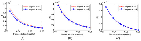 To study the effect of aspect ratio, magnet a and b are first used with different separation distances (W). The magnitude of the distortion magnetic field is simulated as Figure 9. It is observed that when the distance between the two magnets is 2 cm, the magnitude of the distortion field increases as the aspect ratio decreases. Proximity sensor using the magnet b generates a bigger disturbance field than magnet a. The difference is 13.66% between the magnet a and magnet b. As the distance between the two magnets increase, the effect of the aspect ratio is weakened. The difference between the magnet a and magnet b is only 3.8% when the distance between the magnets is 4 cm, and further reduced to 0.68% when the distance between the magnets is 6 cm. This comparison indicates that although the aspect ratio of the magnet does have an impact on the sensor performance, it might not be the dominant one depending on the distance between the magnets.