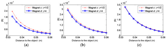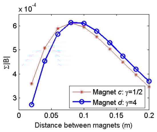 Although magnet c and d have different aspect ratios, similar conclusions can be drawn about the relation between the distortion field strength and the distance between the magnets. As shown in Figure 11, the magnitude of the distortion field increases with the distance between two magnets and reaches the maximum value when distance between the magnets is 8 cm. This is a theoretical optimal distance and can be used as guidelines when the actual distance is decided.
