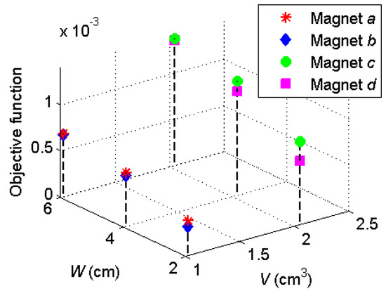 In summary, three optimization variables have been discussed: aspect ratio of the permanent magnet, volume of the permanent magnet, and the separation distance between the two magnets. The design optimization strategies for an onboard magnetic proximity sensor can be interpreted. First, the volume of the permanent magnet has a proportional relation with the distortion field strength, which means a bigger magnet is always a better option if the space and load demands are met. Second, after fixing the volume of the magnet, a random aspect ratio can be decided. Then the distance between the two magnets can be decided considering the theoretical optimal distance and the spatial configuration inside the robot. Finally, if a large distance between the magnets has been chosen, the aspect ratio of the magnet has little influence over the distortion field strength, therefore can be decided only from the mechanical design point of view. If a small distance between the magnets has been decided, magnets with smaller aspect ratio should be used. Considering the four magnets in Table 1, the objective function in (4) can be calculated and plotted in Figure 12.