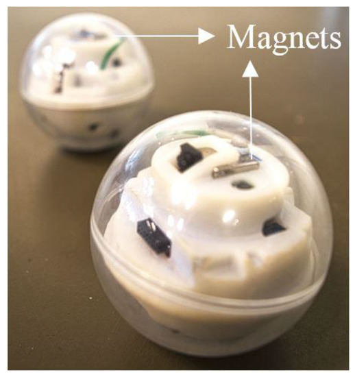 Commonly used proximity detection solutions include ultrasonic transceivers, infrared and optical sensors, wireless sensor network, and electromagnetic devices such as inductive/capacitive sensors. Ultrasonic transceivers [22,23,24], although an economical and robust choice for obstacle detection, cannot be used for spherical robots due to the plastic shell that completely encloses the drive cart unit. As a result, the ultrasound signal cannot penetrate the shell. Cameras and infrared sensors are widely available on the market and have been used for navigation purposes [25,26,27], however, their application requires a supporting pattern recognition algorithm, which would demand considerable computational efforts and high processing capability. Also, their performance could soon deteriorate as the shell transparency quickly reduces due to abrasion. Wireless sensor networks [28] usually drain the power fast and many of them, such as UWB technique [29], require external beacons to be set up before the robot operation. Commercial inductive and capacitive sensors [30], although not affected by the shell at all, are simply too big to fit in the sphere. Therefore, a passive magnetic sensor [18] has been proposed and directional proximity detection has been achieved by using a magnet assembly to magnify the magnetic disturbance due to approaching ferromagnetic obstacles. The only sensor needed is the magnetometer, which adds minimum energy consumption and can even be neglected when using the existing magnetometer inside the inertial measurement unit (IMU).