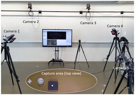 Given the robot size and configuration shown in Figure 5 and considering the design optimization strategies detailed in previous section, two magnets of size (L = 1/2 inch, H = 1/8 inch) are chosen and installed on the robot platform, as shown in Figure 13. The mechanical parameters of the robot are detailed in Table 2. To evaluate the obstacle avoidance performance, an optical motion tracking system (T160, VICON, Oxford, UK) consisting of five IR cameras is used to capture the robot behavior, as shown in Figure 14.