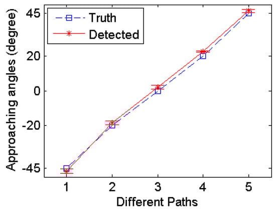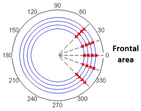 Using this relation, the reconstructed locations of the object are computed and shown in Figure 17, where blue lines indicate the distance to the object to be 3–6 cm and the black dash lines indicate the approaching angles to (−45°, −20°, 0°, 20°, 45°) counterclockwise. The intersection points of the blue line and black dash lines are the actual locations of the obstacle. The red cross represents the reconstructed locations and they correspond to the actual locations accurately.