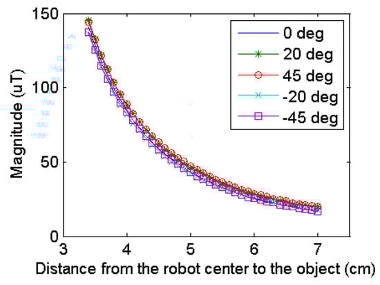 The magnitude of the measured distortion field is shown in Figure 16. It can be seen the maximum distortion field is detected when the object is 3.5 cm away from the magnetometer. Since the robot shell has a radius of 3 cm, this is approximately the closest location the object can be. And as the distance increases, the magnitude of the distortion field reduces. It is noticed that the relation between the magnitude and the distance to the object shows similar trend regardless of the approaching angle. This indicates if the object geometry is known, the distance between the object and robot can be simply calculated from the magnitude. When data in Figure 16 are used for the curve fitting, a simple relation between the magnitude and distance can be approximated in a close form solution as (6):