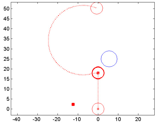 To validate the proposed obstacle avoidance algorithm, the numerical computing software MATLAB is used to simulate the reaction when one robot detects the presence of an obstacle while in motion. Considering the magnetic noise to be smaller than 10 µT, the actual detection range of the sensor is approximately 3 cm outside the shell based on Figure 16. A waypoint zone is set so that the robot stops moving when it comes close enough to the target waypoint. Simulation parameters are listed in Table 4 and the computed course is shown in Figure 18. The robot path is indicated by the red dot line. When the distance between the robot and the obstacle is smaller than the detection range (the robot detects the obstacle), where the robot location is marked with bold red circle, an intermediate waypoint marked with red rectangular is generated. And after turning 90° counterclockwise, the robot adjusts its course towards the intermediate waypoint. When the distance between the robot and the obstacle increases to a safe level, the robot again adjusts its course towards the original target waypoint.