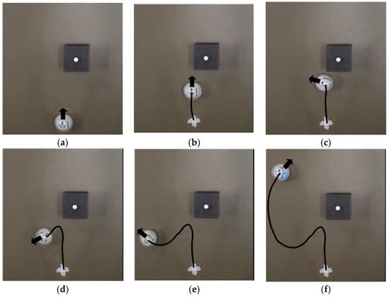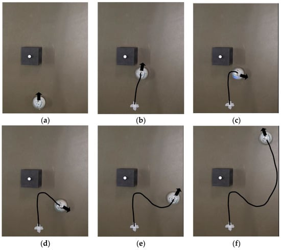 Snapshots of the robot course as it detects and avoids the obstacle while still reaching its target waypoint: (a) Robot starts moving; (b) Robot moves closer to the obstacle and detects its presence; (c) Robot turns counterclosewise after detecting the obstacle; (d) Robot adjusts its course towards the intermediate waypoint; (e) Robot adjusts the course again to reach its original target waypoint; (f) Robot approaches the target waypoint.