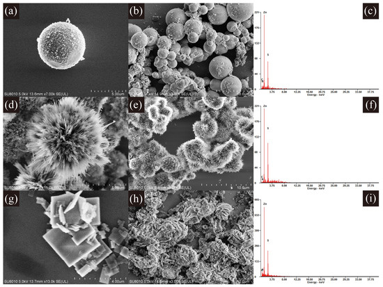 Scanning electron microscopy (SEM) and energy dispersive X-ray spectroscopy (EDX) results of ZnS nanostructures synthesized with different CHN:HO ratios of (a–c) 0:1; (d,f) 1:1 and (g–i) 3:1.