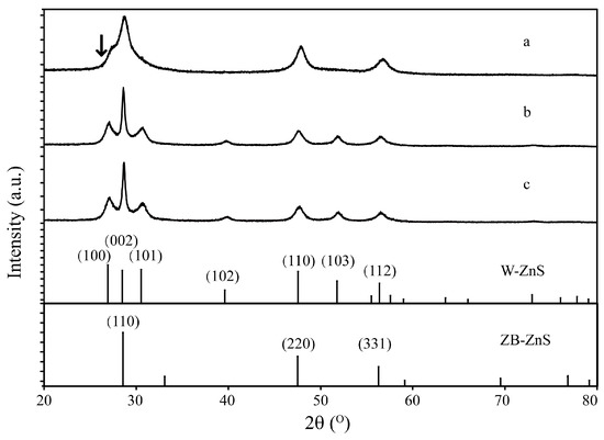 The crystallinity of the ZnS nanostructures was characterized by XRD. The diffraction peaks in Figure 2a indicate that the synthesized ZnS nanoparticles are mainly of zinc-blende structure in accord with the reported data (JCPDS File No. 05-0566). There is also a trace of wurtzite structure in the ZnS nanoparticles with a very weak peak at shown by the arrow, indicating the diffraction of the (100) plane of the wurtzite structure. The diffraction peaks in Figure 2b,c show that the ZnS urchin-like nanostructures and nanoflakes have a wurtzite structure according to the standard card (JCPDS File No. 75-1534).