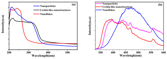 Absorption spectra of synthesized ZnS nanocrystals are shown in Figure 3a. It can be seen that the products with different morphologies have absorption edges at 244 nm, 314 nm and 320 nm respectively which were calculated by finding the crossing points of x-axis and the tangent line of the absorption cures with largest slope. The high absorption values in the UV area also confirms the existence and purity of ZnS nanocrystals. Figure 3b shows the photoluminescence spectra excited at a wavelength of 310 nm. The fluorescence peak at 380 nm was due to the hole traps originated from unsaturated orbital of the surface S atoms, while the defect emission at 470 nm mainly originates from point defects induced by the isolated Zn vacancies [27,28,29].