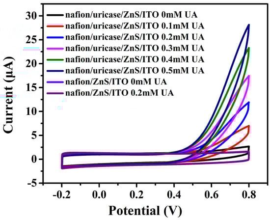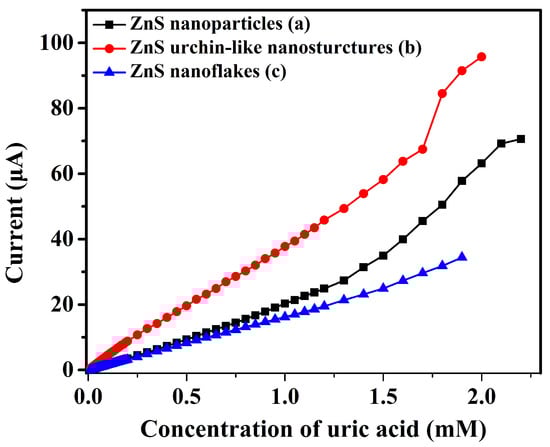 It can be seen in Figure 4 that there were no current rising on the bare nafion/urchin-like ZnS nanocrystals/ITO electrodes with UA. However, a strong rising of current in the biosensor electrode made of nafion/uricase/ZnS urchin-like nanostructures were observed as the UA concentration increased as a consequence of the electrocatalytic oxidation of UA. The same electric response was found in ZnS nanoparticles and the nanoflakes-based electrode. This demonstrates the oxidization of uricase by the catalysis of the enzyme. ZnS nanocrystals increased the surface area for enzyme immobilization and preserve the bioactivity of the enzyme after the immobilization process. The high conductivity of the nanomaterials also facilitates the fast transfer of electrons generated from the oxidation reaction of HO between the anchored enzyme and the conducting substrate.