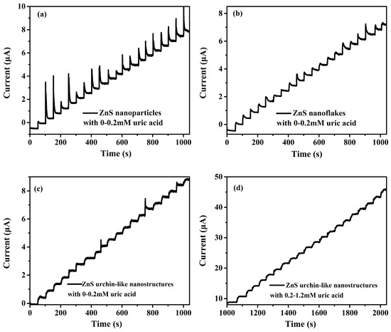The amperometric response for the UA of different biosensors were also measured. In Figure 5, all three biosensors showed rapid current rising at an applied potential of 0.8 V with the addition of UA in a long range under the stirring condition. Compared with nanoparticles and nanoflakes, the current stairs of ZnS urchin-like nanosensor in Figure 5c is more steady without much sharp rising and slow decreasing as shown in Figure 5a,b. The shortest current balance time is 9 s on average in Figure 5c, 13 s in Figure 5a and 17 s in Figure 5b. At a higher concentration beyond the detection linear range, the current became unstable and saturated.