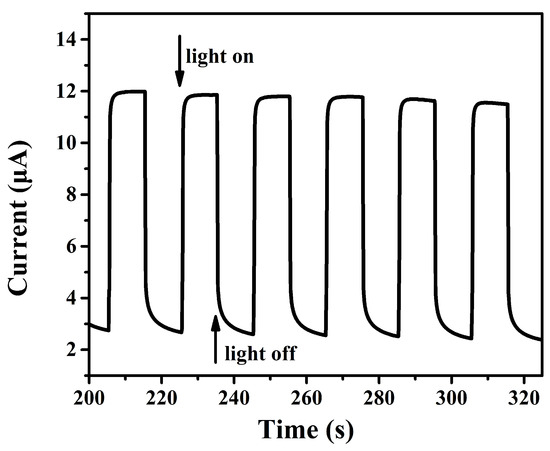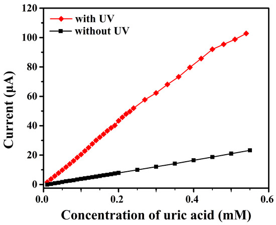 The photoelectrochemical UA detection was the same as electrochemical method with one exception of the 300 nm UV irradiation. The working electrode was tested while exposed to the illumination of a 200 W mercury lamp. The photocurrent also increased linearly with the addition of UA. The photocurrent response were about 5 times higher than that without irradiation when same amount of UA were added (Figure 8). The sensitivity of UA determination under UV light exposure was 413.98 AcmmM, while the linear range was 0.01 M–0.55 M, lower than that without illumination. The detection limit was 0.045 M. The theory proposed by Sun can be referred here to explain the mechanism of photoelectrochemical sensing of UA by nafion/uricase/ZnS/ITO electrode as follows [31]: Electron and hole pairs were generated with irradiation due to the photoelectrochemical property of ZnS nanostructures. The intermediate product HO was oxidized by the valence-band hole and generated an electrochemical current while the conduction-band electron was transferred to the electrode to produce a photocurrent. The current response with irradiation was actually composed of electrochemical current and photocurrent. So, the ZnS biosensor was more responsive towards UA than without illumination.