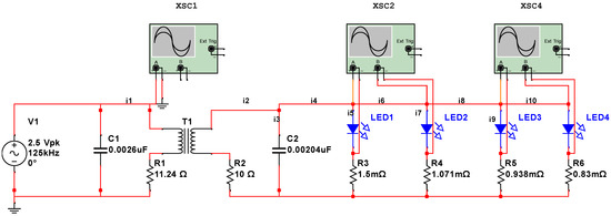 A model of the sensor circuit was created using NI Multisim circuit modeling software (v. 14.0, National Instruments Corporation, Austin, TX, USA). The circuit consists of four LEDs assembled in parallel branches. Each LED is connected to a resistor in series that represents the electrical resistance of each metal strip. In this work, we considered 125 kHz frequency typically used in low frequency RFID systems. Typical working range of low frequency RFID systems and wireless charging stations is just a few centimeters. Standard characteristics of wireless charging devices can be obtained from specifications listed in Ref. [24]. Figure 2 shows a schematic diagram of the circuit containing four LEDs. The transmitter is shown in the left part of diagram and contains a resonant circuit with a voltage source.